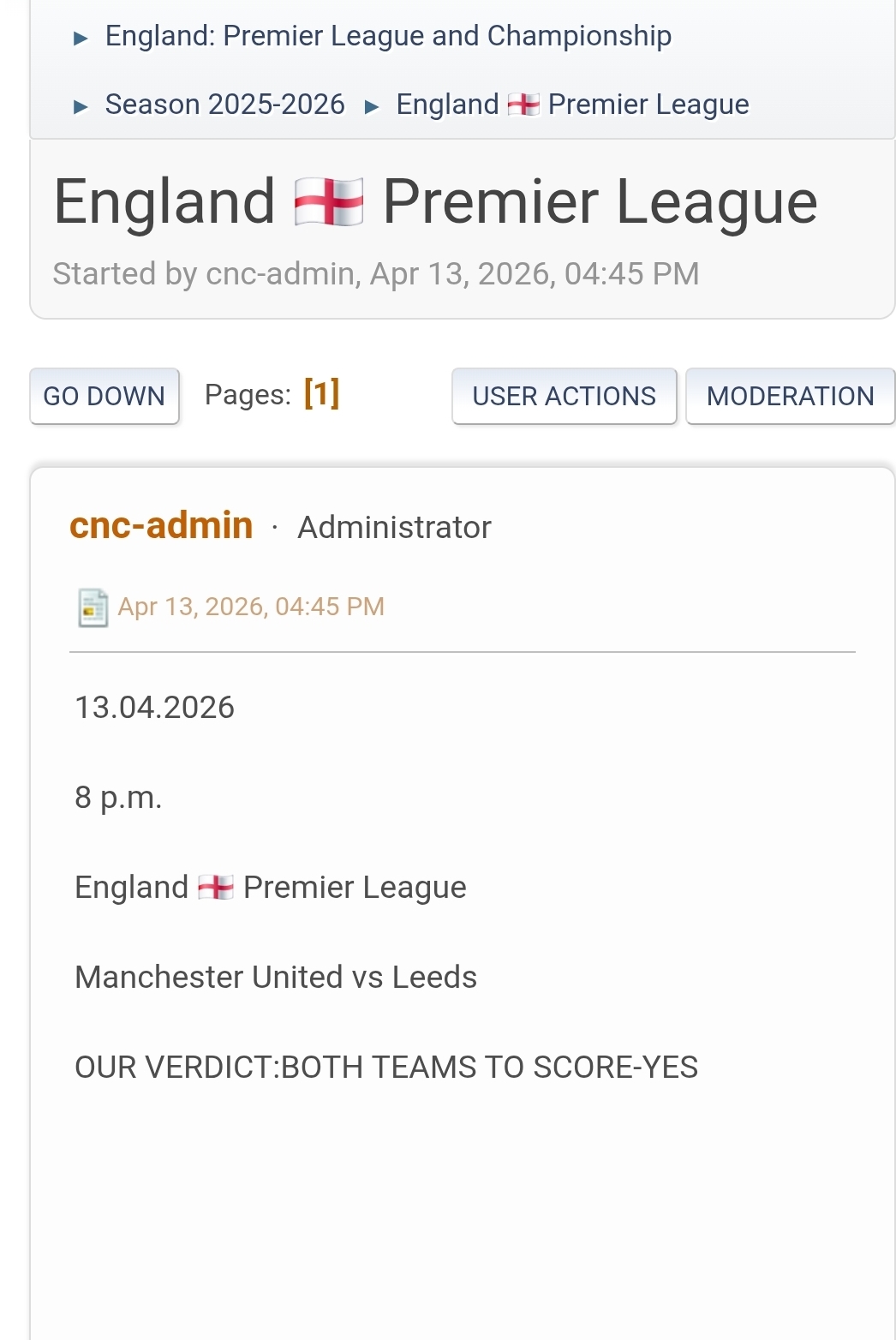 14.04.2026 Serge Novik Tips 013.04.2026 8 p.m.England 🏴 Premier LeagueManchester United vs Leeds OUR VERDICT:BOTH TEAMS TO SCORE-YES